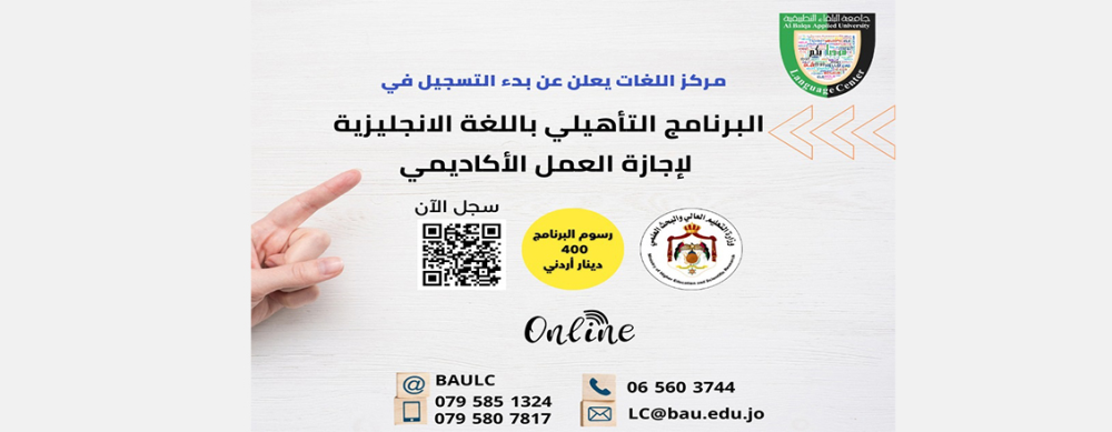 يُعلن مركز اللغات – جامعة البلقاء التطبيقية عن فتح باب التسجيل في: * البرنامج التأهيلي باللغة الإنجليزية لإجازة ممارسة العمل الأكاديمي& ...