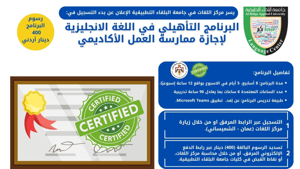 يُعلن مركز اللغات – جامعة البلقاء التطبيقية عن فتح باب التسجيل في: * البرنامج التأهيلي باللغة الإنجليزية لإجازة ممارسة العمل الأكاديمي ...