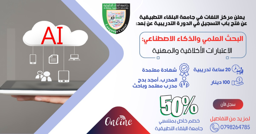 يعلن مركز اللغات في جامعة البلقاء التطبيقية عن فتح باب التسجيل في الدورة التدريبية عن بُعد: *البحث العلمي والذكاء الاصطناعي: الاعتبارات الأخلاق ...