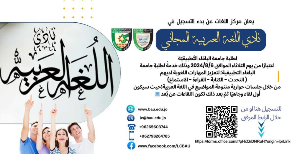 يعلن مركز اللغات في جامعة البلقاء التطبيقية عن بدء التسجيل في  *نادي اللغة العربية المجاني* وذلك اعتبارًا من يوم الخميس الموافق 8 أغسطس 2024. ي ...