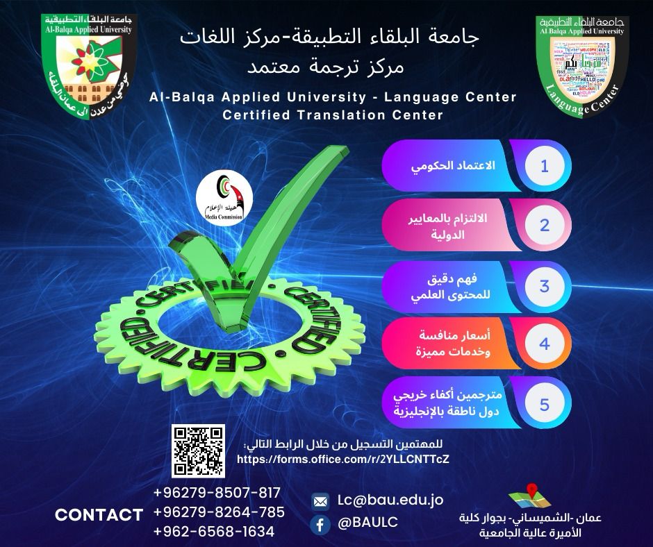 يسعدنا أن نعلن أن مركز اللغات في جامعة البلقاء التطبيقية أصبح مركزًا معتمدًا ومرخصًا لتقديم خدمات الترجمة بجميع أنواعها بما فيها الترجمة القانونية وتر ...