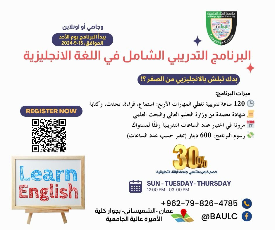 انضم الآن إلى البرنامج التدريبي الشامل في اللغة الإنجليزية المقدم من مركز اللغات في جامعة البلقاء التطبيقية! (وجاهي او اونلاين) • ميزات البرنام ...