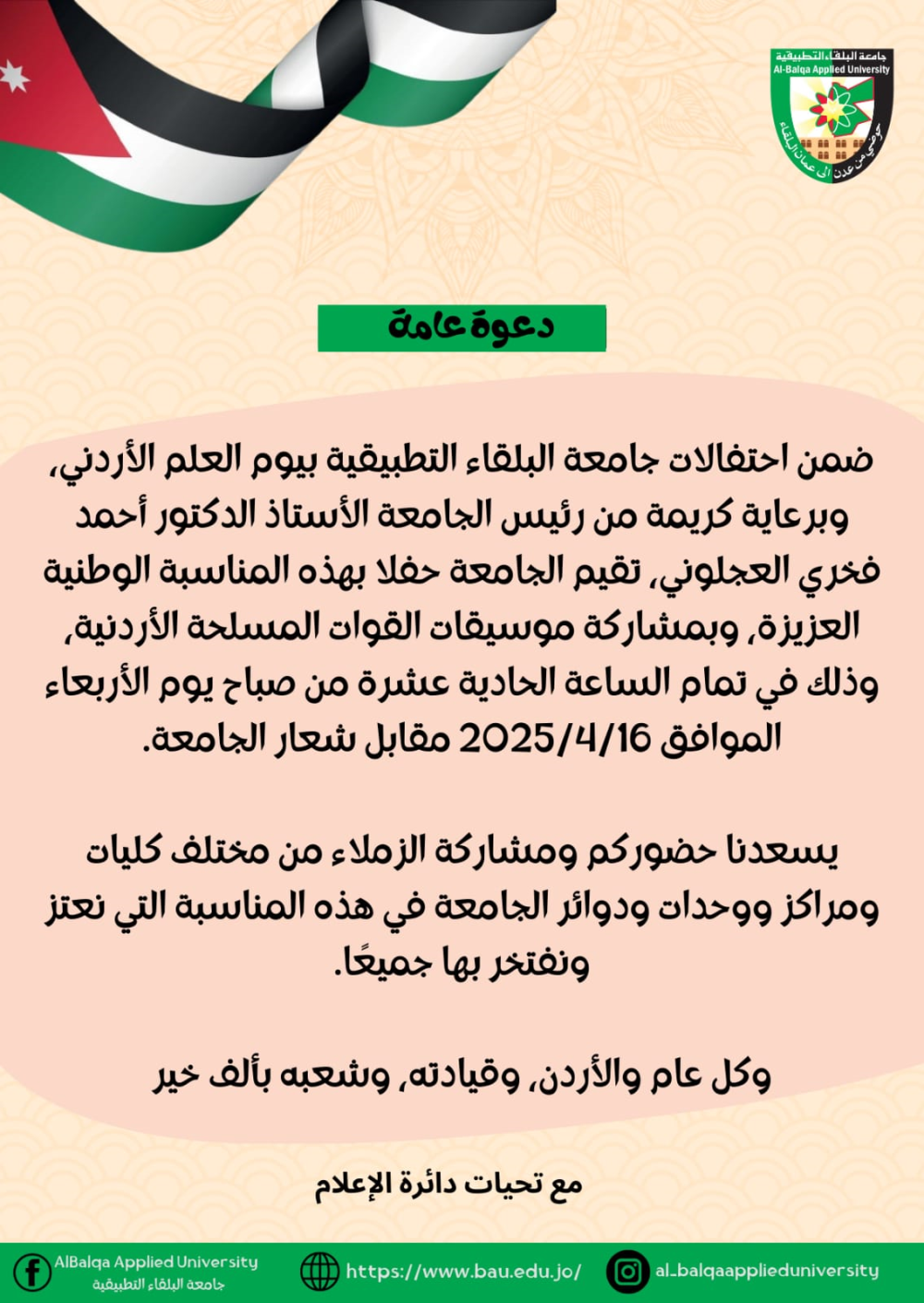 يتقدّم الأستاذ الدكتور أحمد فخري العجلوني، رئيس جامعة البلقاء التطبيقية، بأحر التهاني والتبريكات إلى الزميلات والزملاء من أعضاء الهيئة التدريس ...