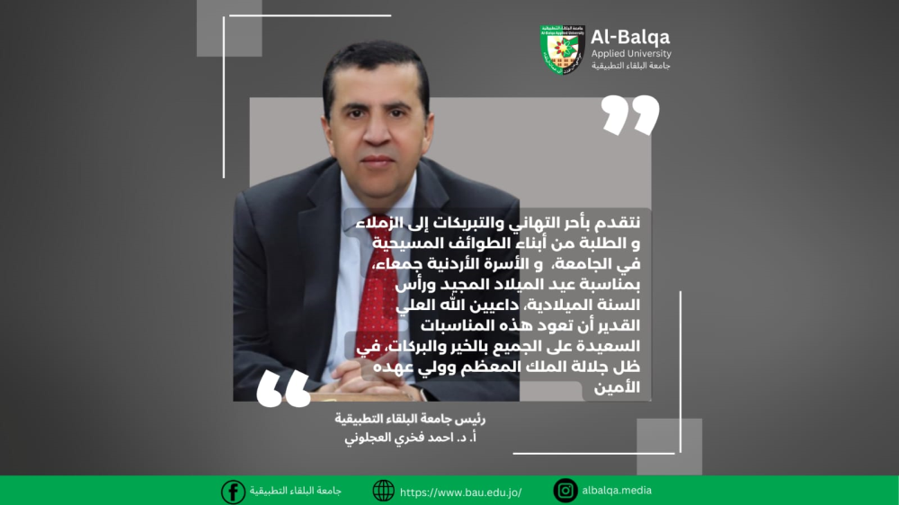 رئيس جامعة البلقاء التطبيقية يهنئ الزملاء والطلبة من أبناء الطائفة المسيحية بمناسبة الأعياد المجيدة