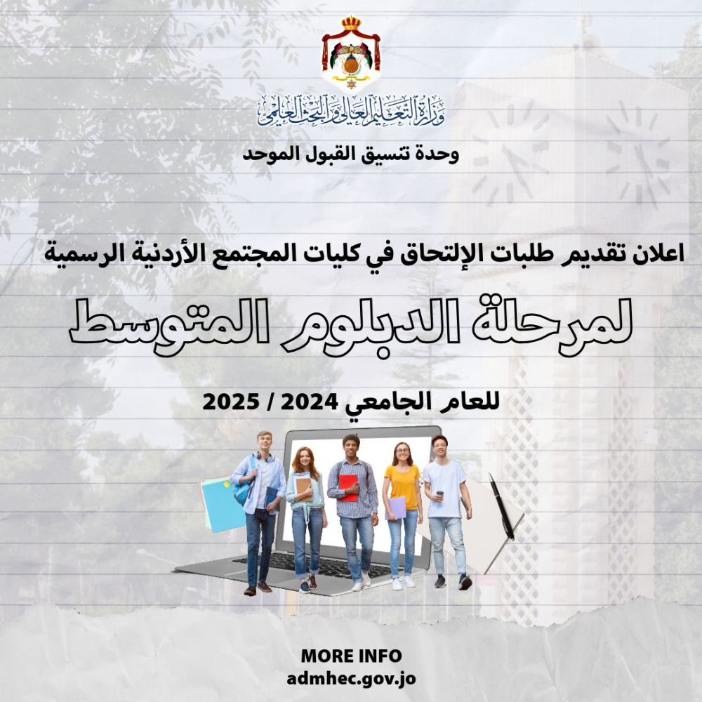 طلبات الالتحاق في كليات المجتمع الرسمية لمرحلة الدبلوم المتوسط للعام الجامعي 2024 - 2025