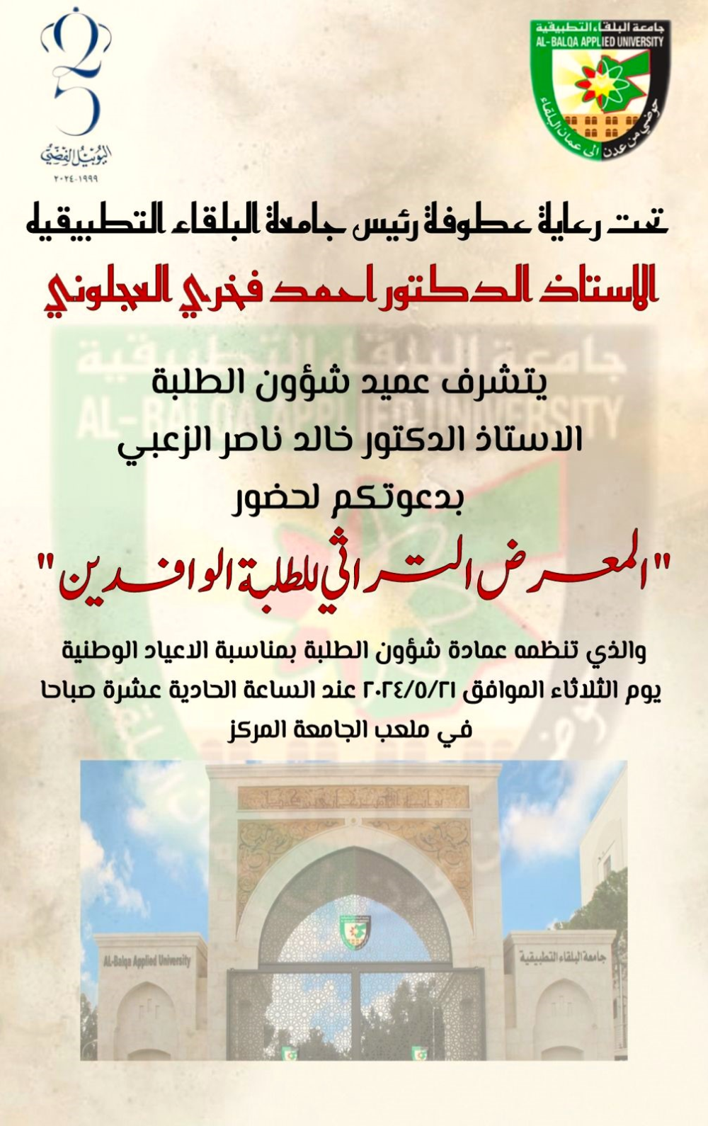 بمناسبة عيد الاستقلال واليوبيل الفضي لتولي جلالة الملك لسلطاته الدستورية البلقاء التطبيقية تنظم معرض التراث السنوي للطلبة الوافدين