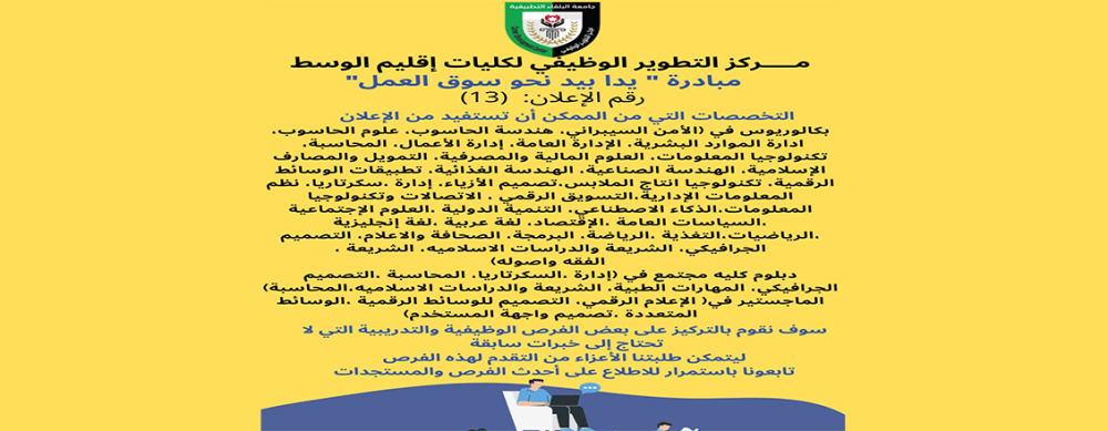 مركز التطوير الوظيفي لكليات إقليم الوسط يطلق الدفعة الثانية والعشرون من فرص العمل لطلبة وخريجي البلقاء التطبيقية ضمن مبادرة (يدًا بيد نحو سوق العمل)
