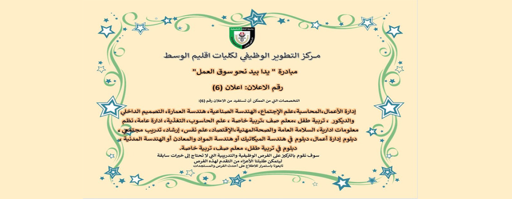 مركز التطوير الوظيفي لكليات إقليم الوسط يطلق الدفعة الخامسة والعشرون من فرص العمل لطلبة وخريجي البلقاء التطبيقية ضمن مبادرة (يدًا بيد نحو سوق العمل)