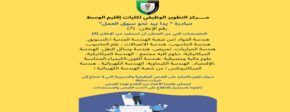 مركز التطوير الوظيفي لكليات إقليم الوسط يطلق الدفعة الثانية والعشرون من فرص العمل لطلبة وخريجي البلقاء التطبيقية ضمن مبادرة (يدًا بيد نحو سوق العمل)