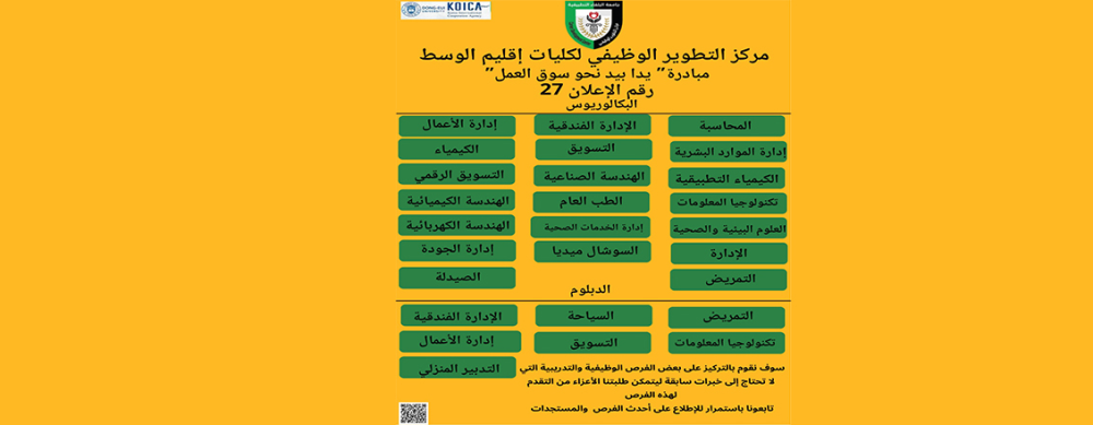 يعلن مركز التطوير الوظيفي لكليات إقليم الوسط في جامعة البلقاء التطبيقية ، وبالتعاون مع شركة خاصة في مجال النقل بتوفير فرصة عمل لوظيفة سكرتيرة ...
