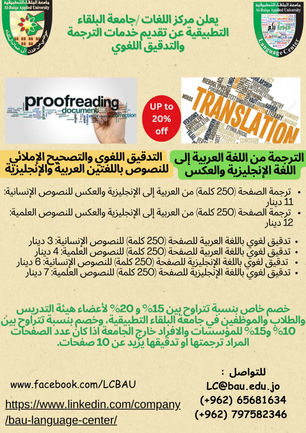 يسر مركز اللغات في جامعة البلقاء التطبيقية الإعلان عن تقديم خدمات الترجمة (من العربية إلى الإنجليزية والعكس) والتدقيق اللغوي باللغتين العربية و الإنجليزية