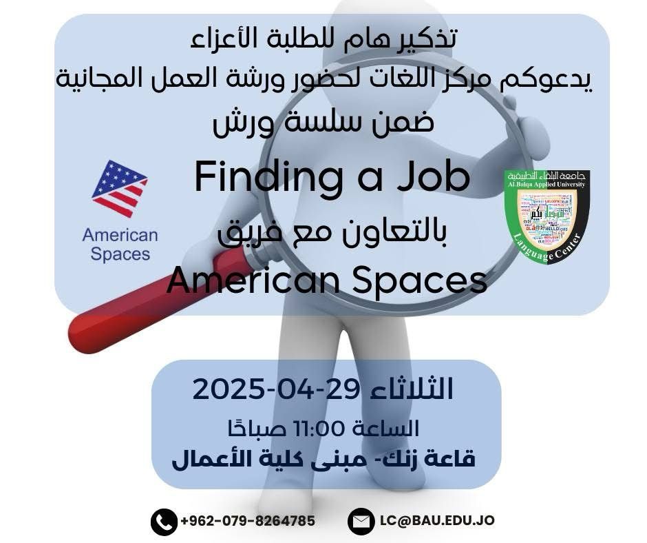 مركز اللغات في جامعة البلقاء التطبيقية يدعوكم لحضور الورشة الثالثة من سلسلة ورش (Finding a Job)