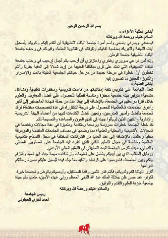 فيسعدني ويسرني باسمي واسم أسرة جامعة البلقاء التطبيقية أن أتقدم إليكم ولذويكم بأصدق