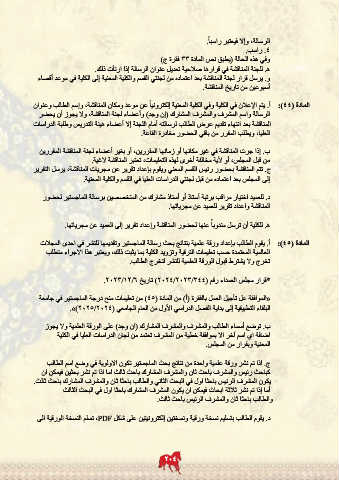 و .يرسل قرار لجنة المناقشة بعد اعتماده من لجنتي القسم والكلية المعنية إلى الكلية في موعد أقصاء